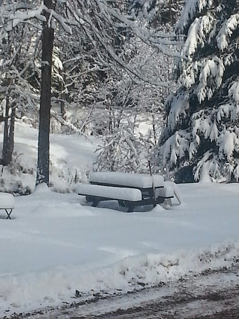 Then it rained and rained and the snow all melted and yesterday we moved home and there was/is water everywhere. We had a lake in our front yard. Overnight it snowed again and now everything is white again and Steve is out plowing again.